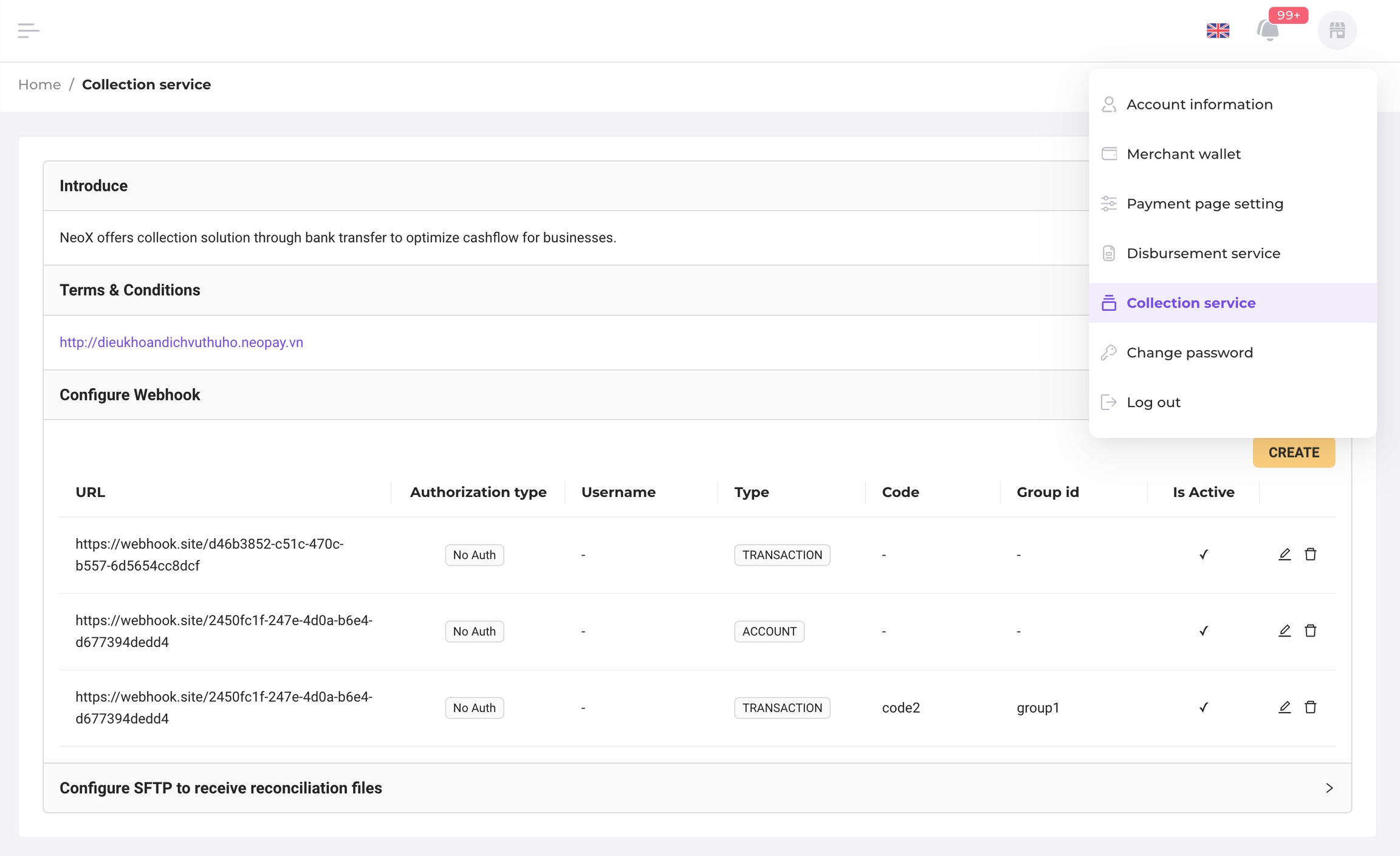 Code: Optional, mapping to "serviceInfomation.code" in creating a virtual account request. If you fill in the "Code", the URL will be received transaction notifications of that virtual accounts having the same "Code".