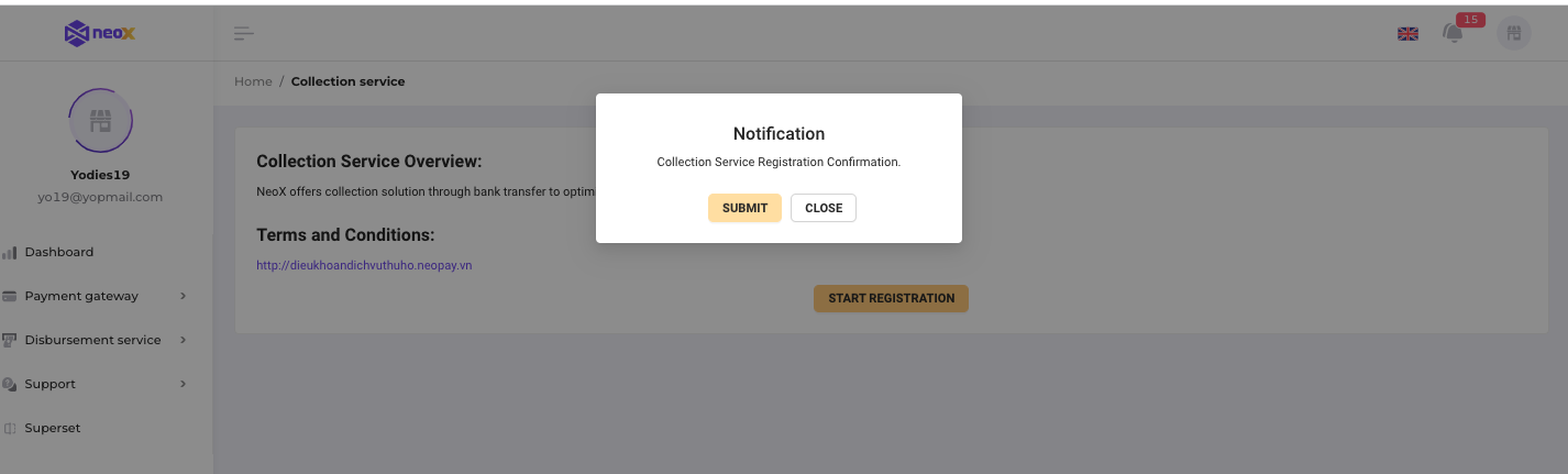 **Step 2:** On the right pane&#x6C;**,** then choose  the **Collection service,** then click on **START REGISTRATION** button, then click on **SUBMIT** button on the confirmation popup.