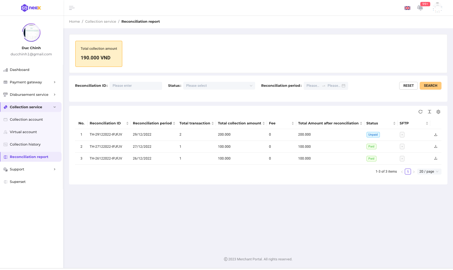 **Conditions:** merchant has at least one successful collection transaction in the reconciliation period.