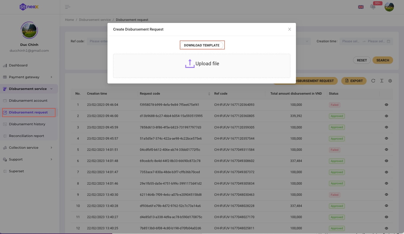 Step 1: On the right panel, choose the Disbursement request under Disbursement service, then click on Create Disbursement Request button.
