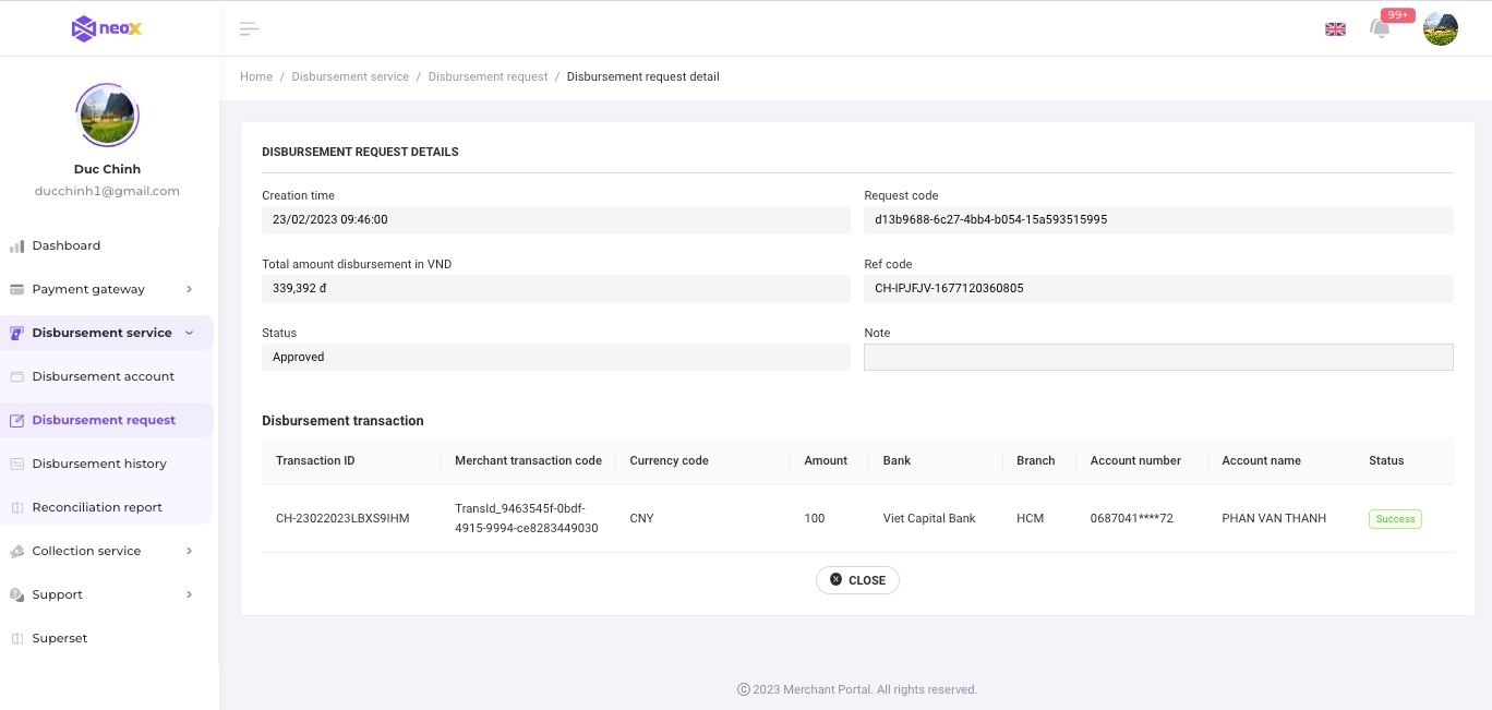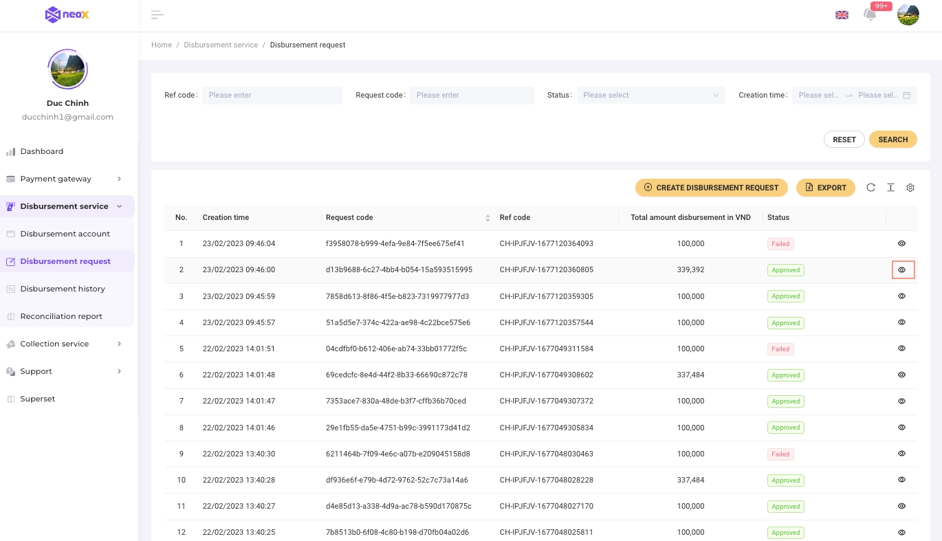 On the list of disbursement requests, click on "Eye" icon to navigation to the disbursement request detail page