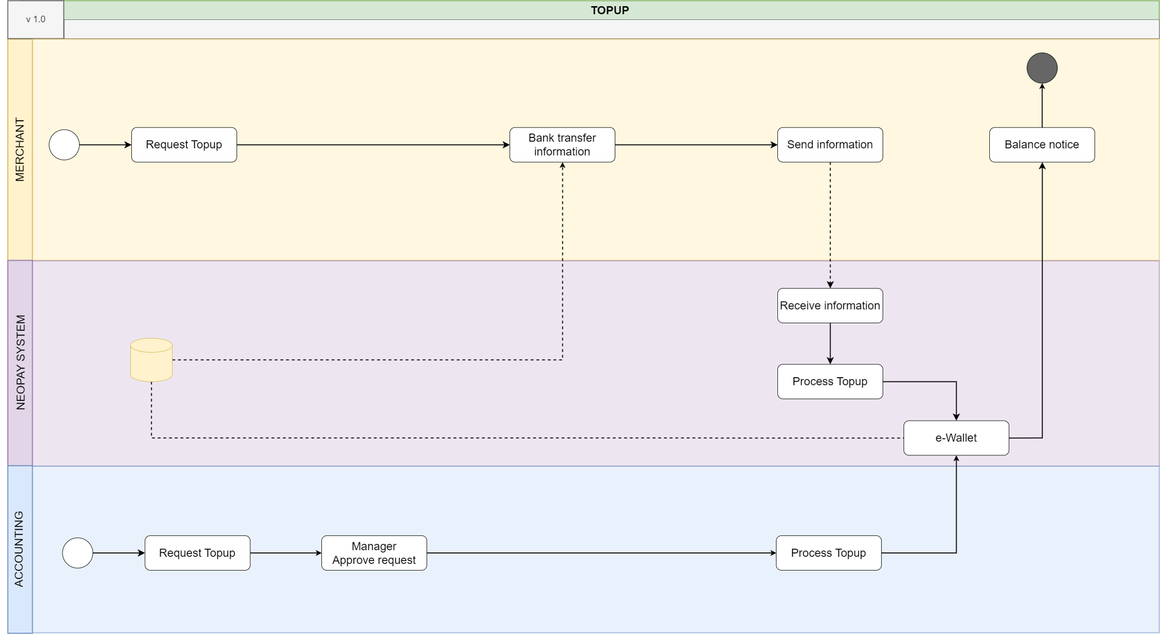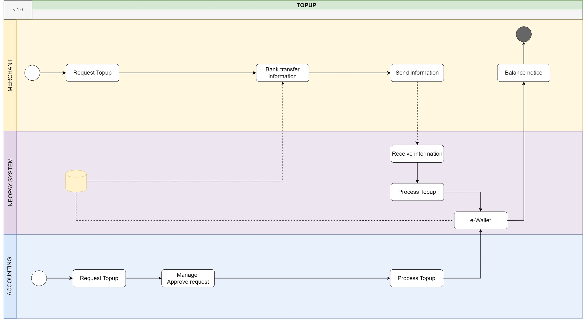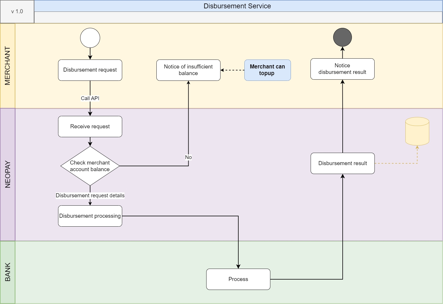 To be able to execute a disbursement order, Merchants need to deposit money to increase their disbursement account; when the payment is successful, the Merchant's disbursement account will decrease accordingly.