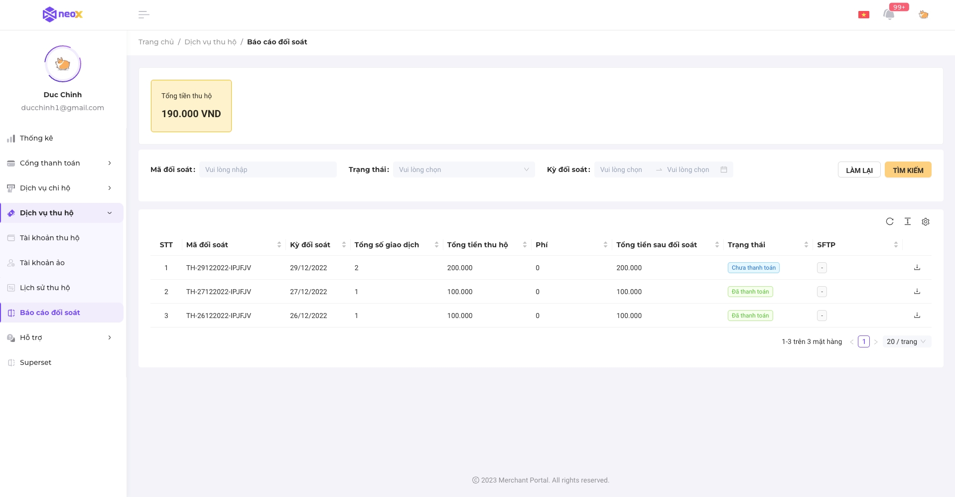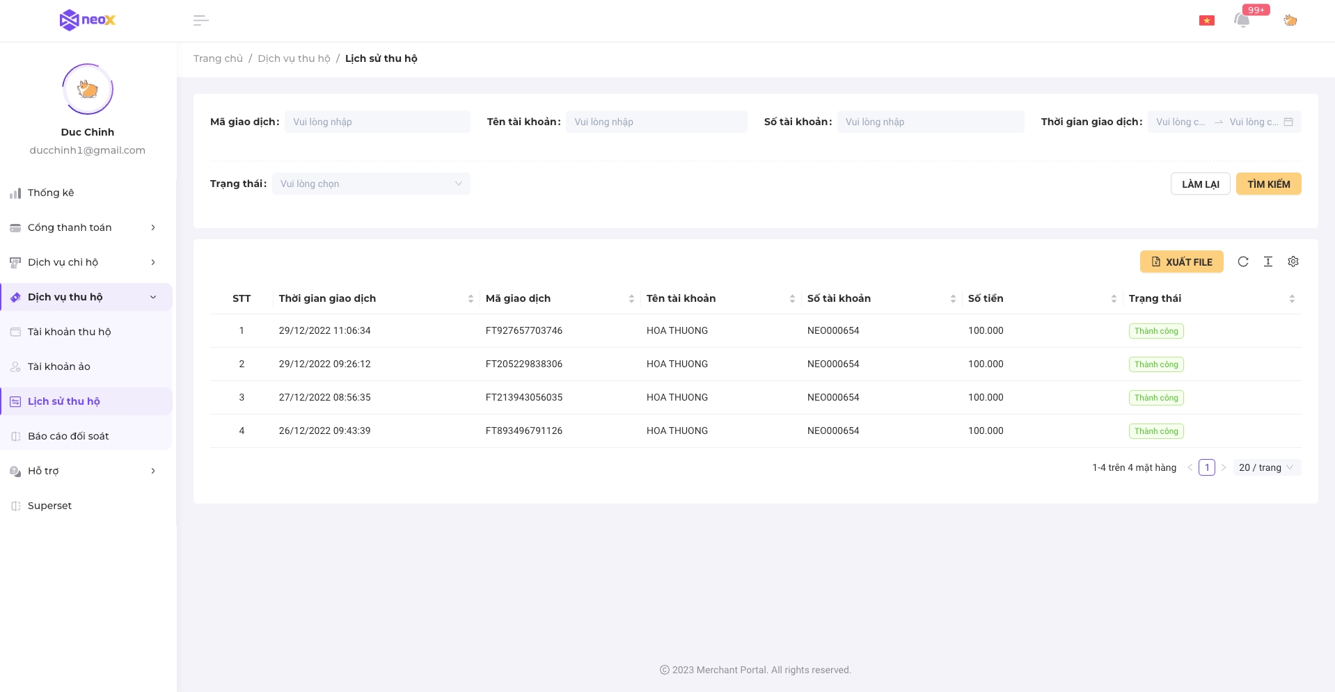 Search by optional information: Reference code, Request code, Transaction code, Status, Request Date.