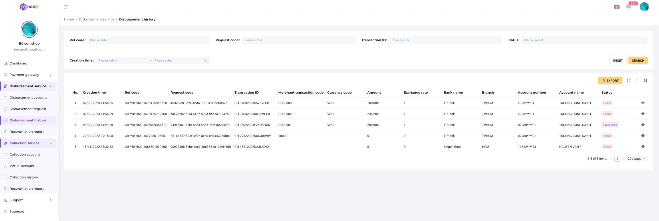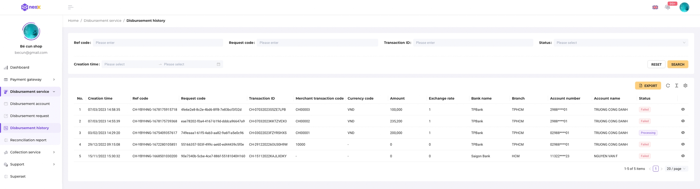 Search by optional information: Reference code, Request code, Transaction code, Status, Request Date.