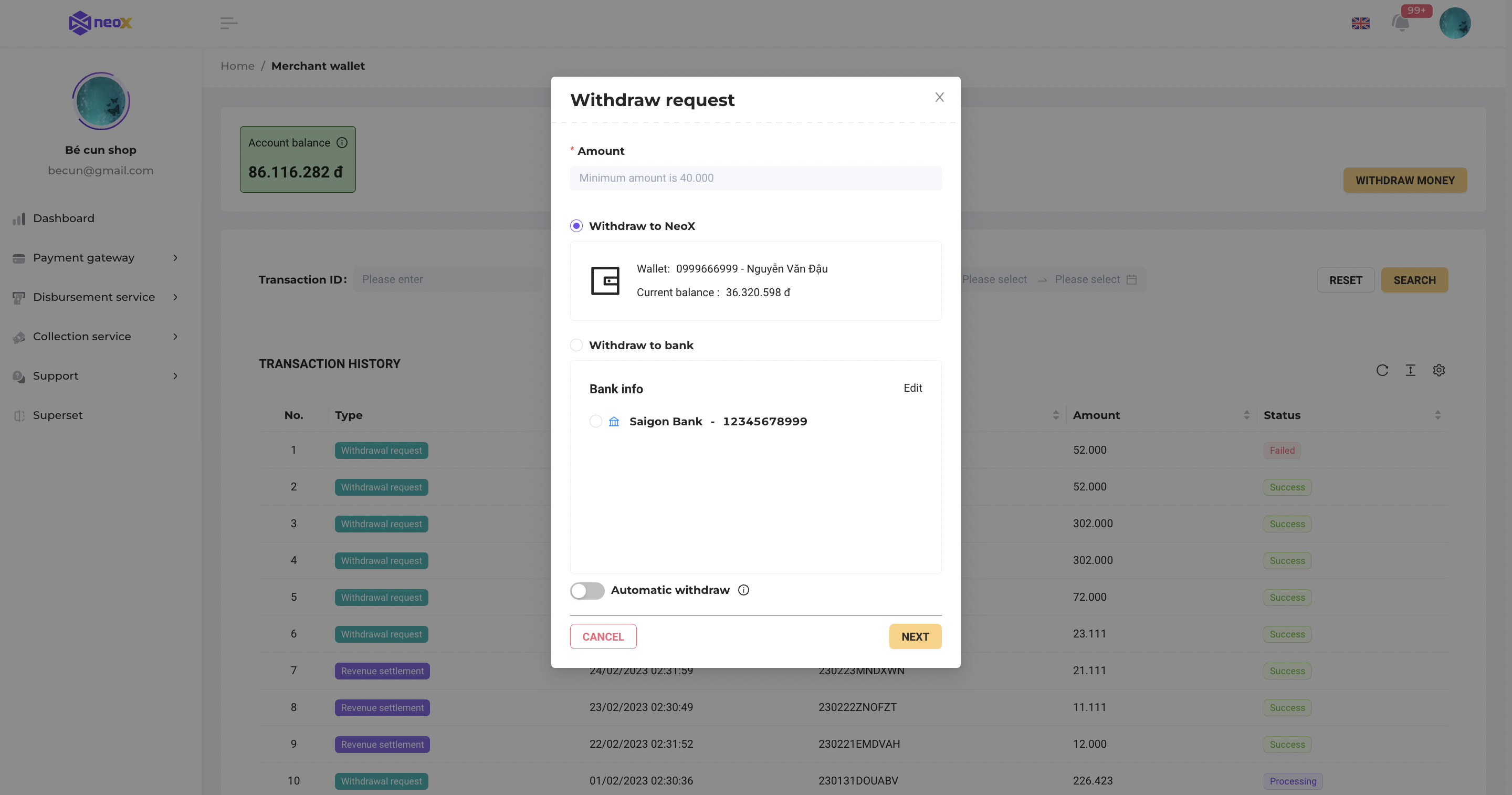 * **Withdraw to NeoX wallet:** Merchant has linked NeoX wallet to withdraw money and made transactions of the NeoX wallet, including: Deposit, Payout, Transfer, Payment.