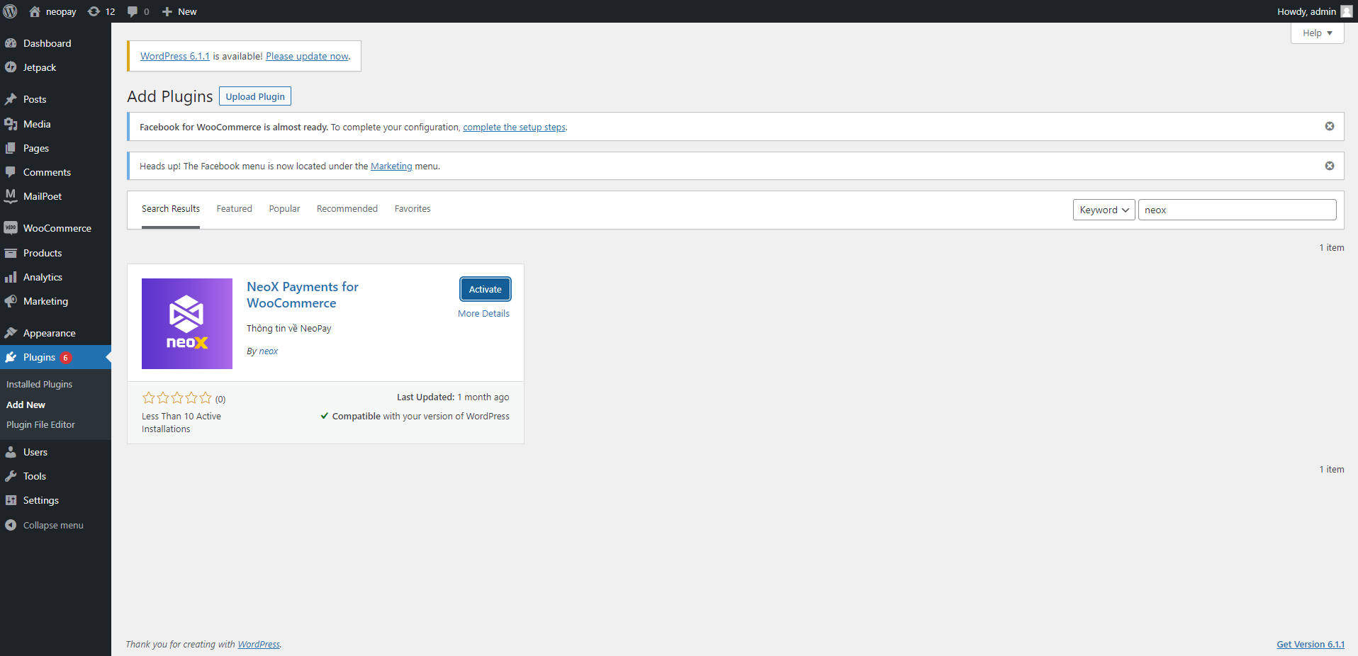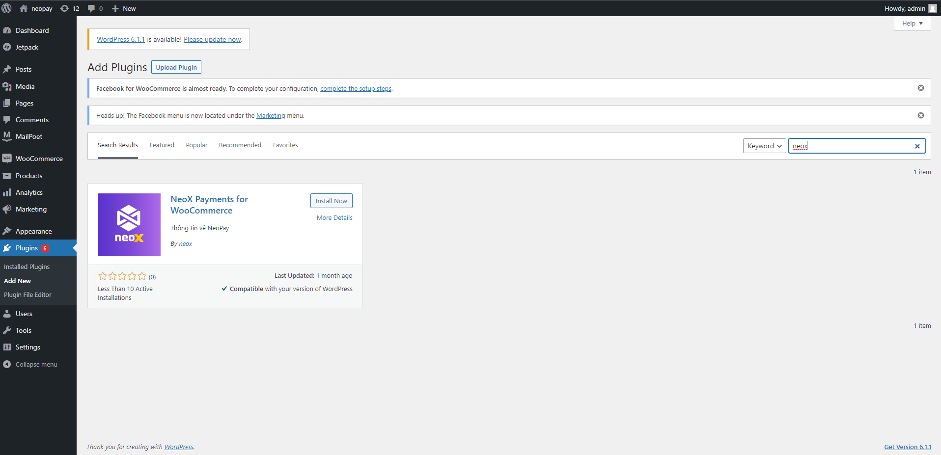 Step 3: Choose the NeoX Payments for WooCommerce plugin, then click on Install Now