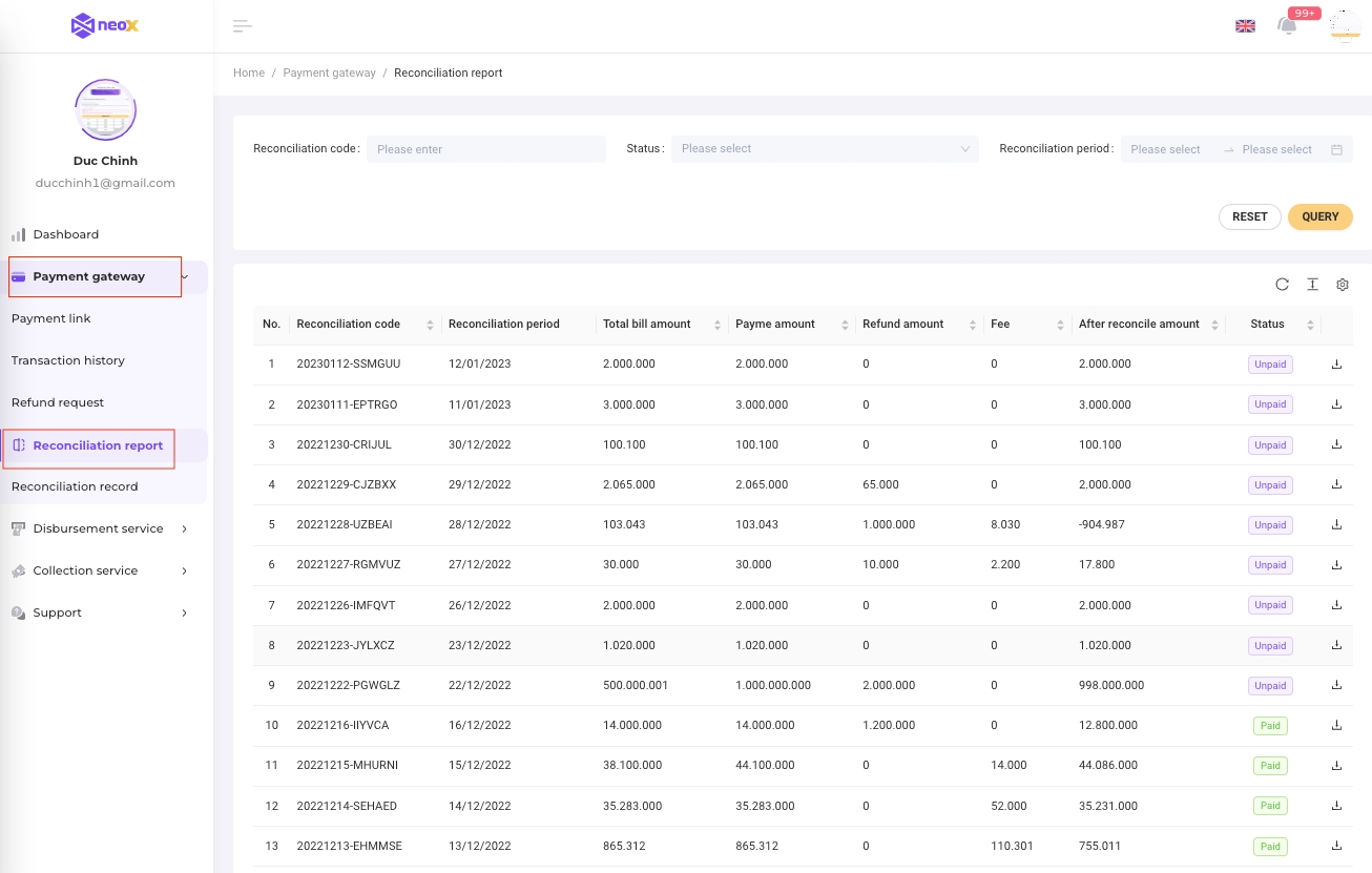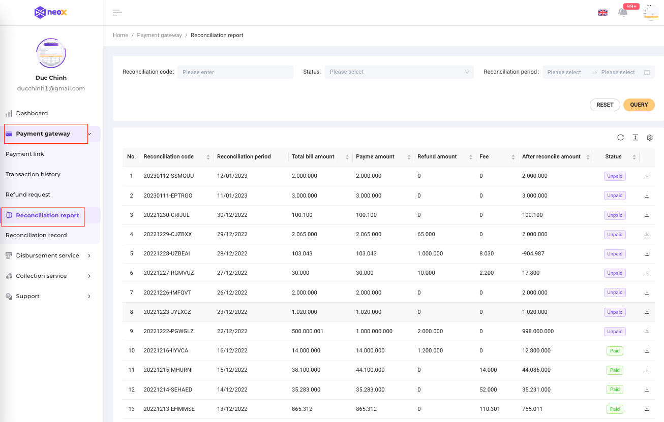 Every day, NeoX system will reconcile all payment transactions of successful orders and refund transactions arising from the previous day.