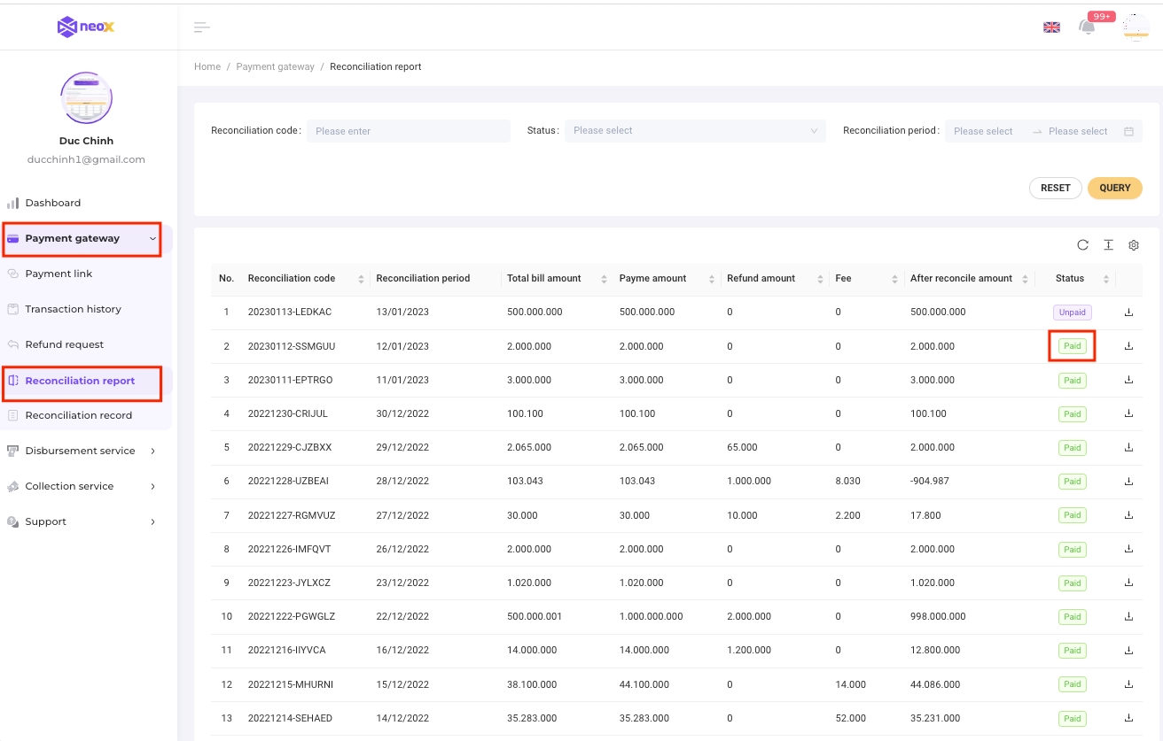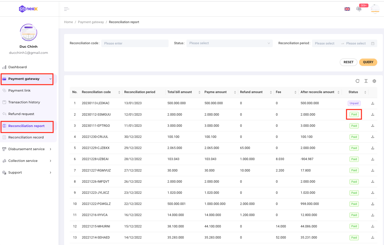 To check the reconciliations have "Paid" status, choose Payment gateway, then choose Reconciliation report.