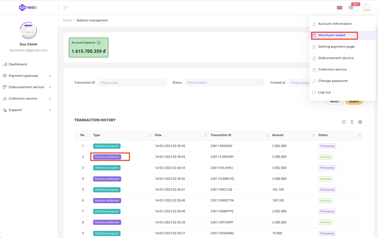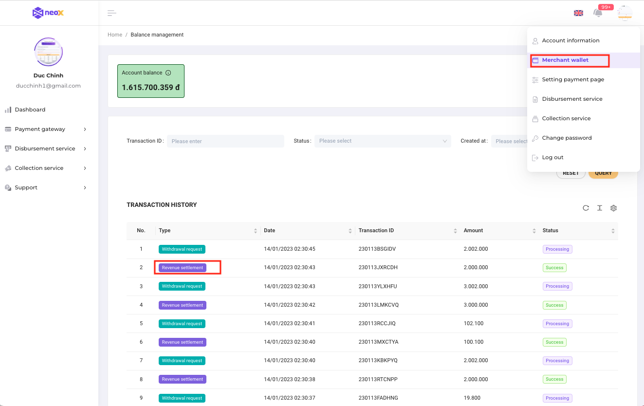 To check the settlement, choose Merchant Wallet and then check records with "Revenue settlement" type