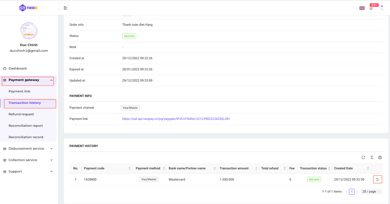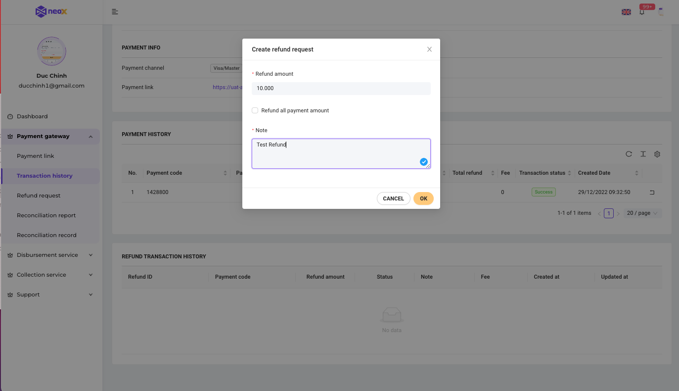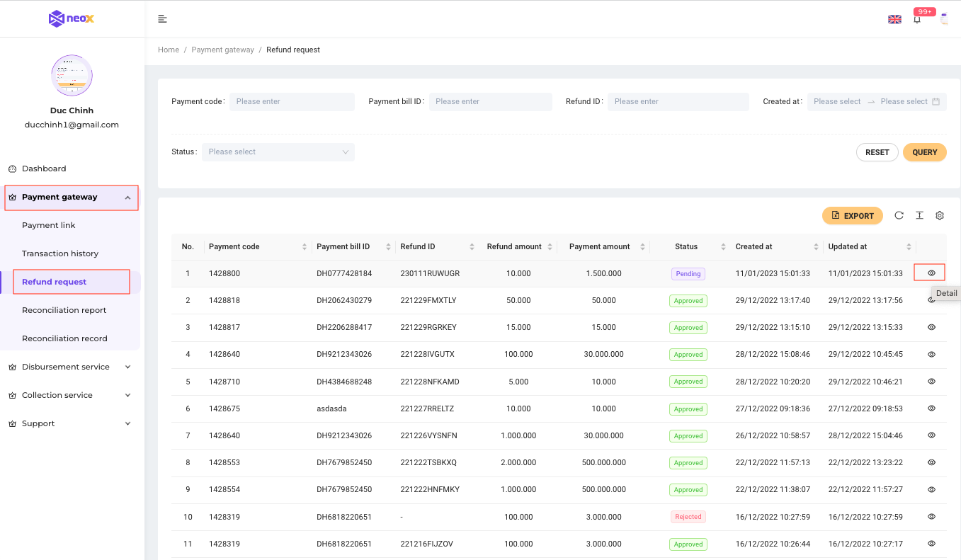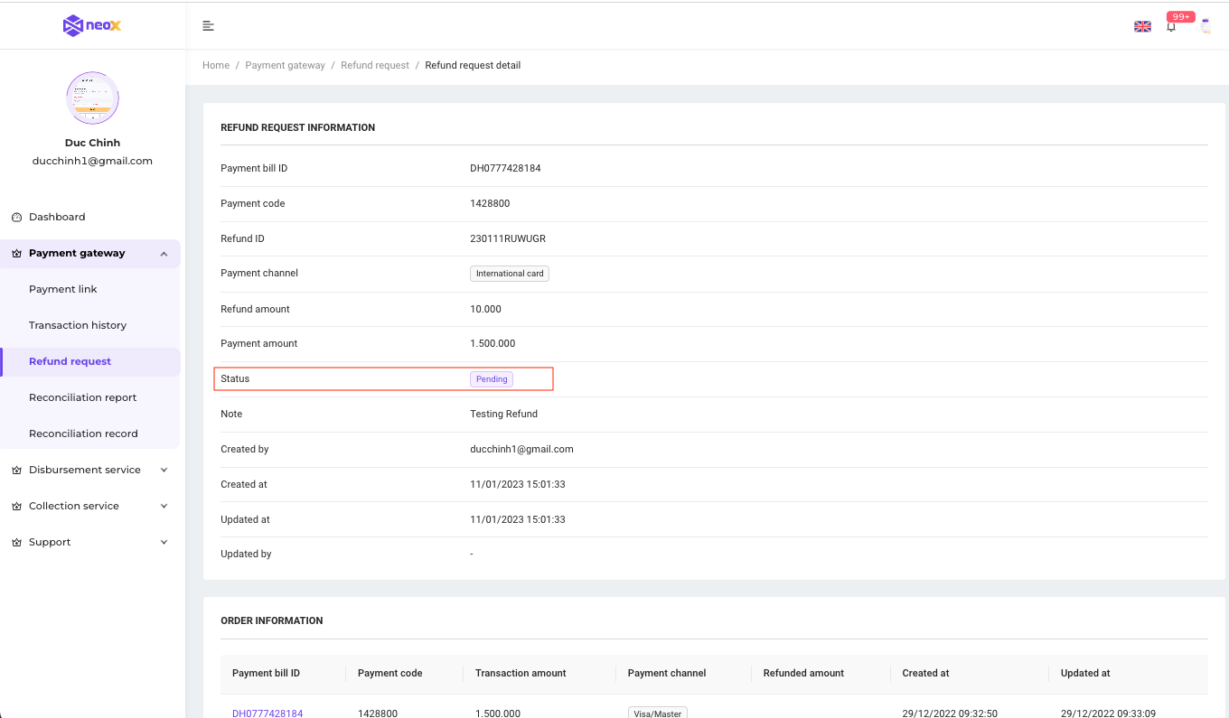**Step 5:** To check the status of the refund request, choose the **Payment gateway** --> choose  **Refund  request** --> choose refund request need to check the status.